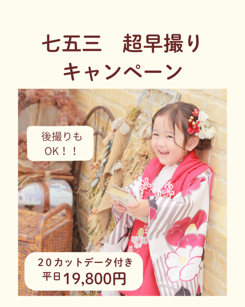 データ20カットがついて平日19,800円 (土日祝日 23,100円)で七五三が撮れる今だけのキャンペーンです。